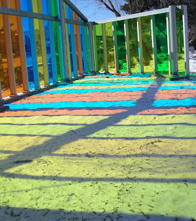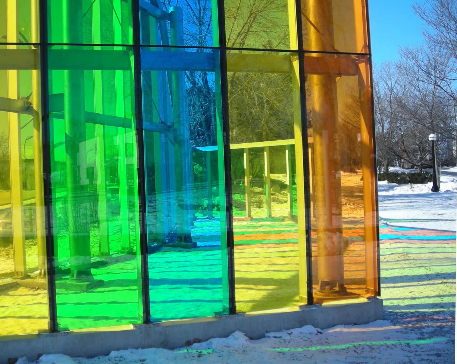 The large, multicoloured, transparent glass walls look amazing in the winter sunshine.